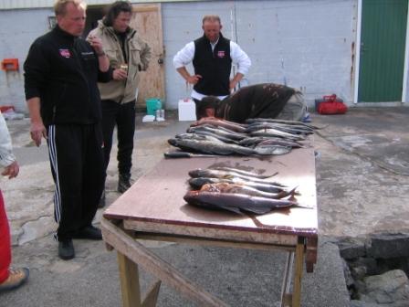 Gleich am Anreisetag waren wir auf dem Wasser und haben natürlich die ersten Fische an dier Luft geholt. Die Fangerfolge in diesem Jahr waren gut, jedoch nicht überragend. Den Sieger-Pokal 2010 konnte sich Thomas "Schnecke" mit einem 103 cm Leng sichern. Ebenfalls einen schönen Lumb landete Markus mit einer Länge von 88 cm und dem Gewicht von 7,45 kg. Es war auch die Vielfalt von Fischen, die uns begeisterte. Leng, Lumb, Pollack, Dorsch, Rotbarsch, Seelachs, Heilbutt und Haie konnten wir aus dem Wasser ziehen. Seelachse konnte man so viele angeln wie man wollte, an den Richtigen Stellen machten wir in kurzer Zeit die Kisten voll. Doch wir hatten es eher auf größere Kammeraden abgesehen und probierten unser Glück in Tiefen bis 250 Metern. Nach dem entdecken einer guten Lumb-Stelle war dies auch der Fisch den wir am meisten gefangen haben (ausgenommen Seelachs). Dosch war leider wenig da und auch nur ein Heilbutt ging unserem Reiseleiter Sigg an den Haken. Umso mehr waren wir von einigen Haien überrascht, die unseren Naturköder nicht wiederstehen konten. Skipper Vodi landete einen klassischen Hai-Hattrick, also 3 Haie hintereinander zu fangen. Da wir die Haie wieder einsetzten war es jedesmal eine Qual sie aus 200 Metern hoch zu holen und wieder von vorn anzufangen. Das machte beim Seelachsfischen in einer Tiefe von 20-40 Metern schon mehr Spass. Da war Action im Boot und die Fische flogen nur so umher. Gegessen haben wir unsere Fänge natürlich auch. Ob als gebratenes Filet, Backfisch oder Fischbuletten schmeckte es immer ausgezeichnet. Die unbedeutende Anzahl von 18 Flaschen wärmender Flüssigkeit hatten wir schon vorzeitig verbraucht und auch das ausgehende Bier zwang uns zum Nachkauf des "günstigen" Norwegerbieres. Alles in allem kann man von einem sehr schönen und erfolgreichen Angelurlaub auf der Insel HITRA sprechen. Reiseleiter Sigg hatte alles gut organisiert und das Team funktionierte. Fotos findet ihr in der Fotogalerie.